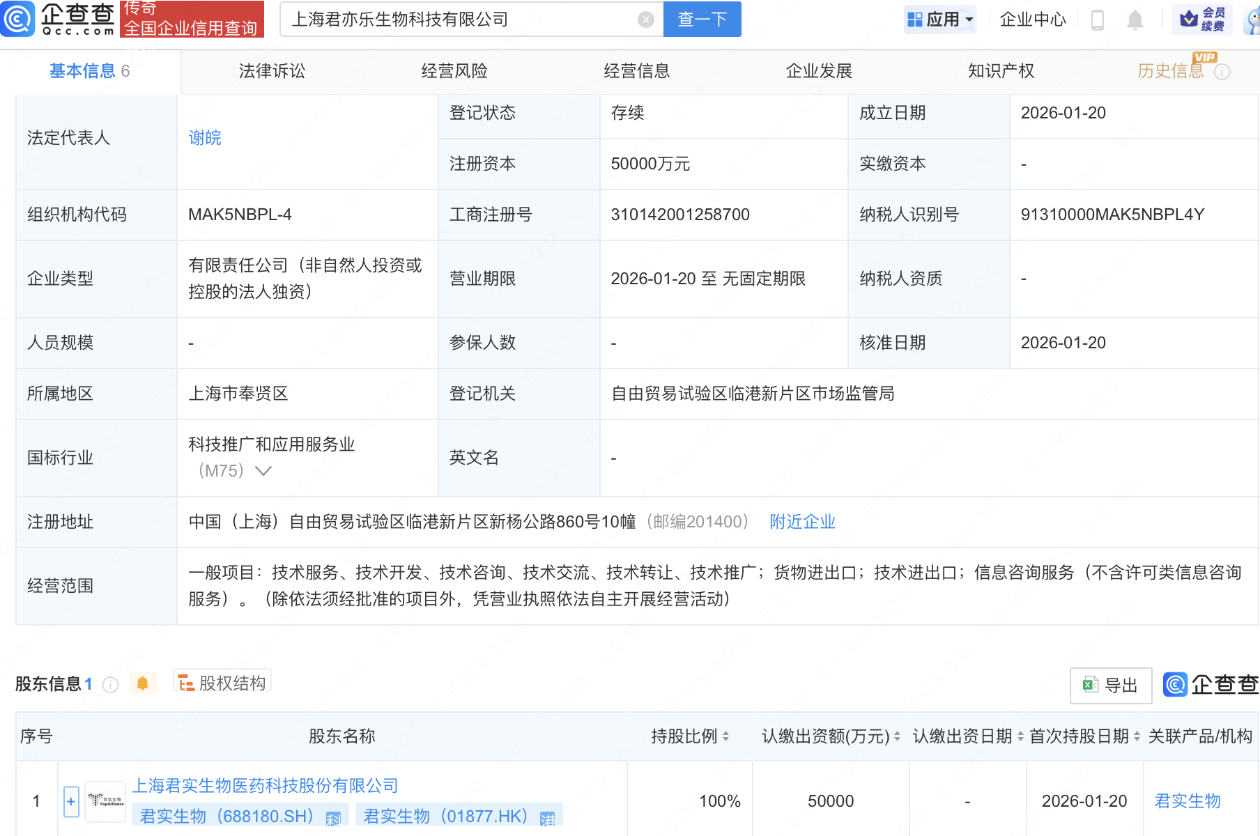 近日,上海君亦乐生物科技有限公司成立,注册资本5亿元,经营范围包含:技术服务、技术开发、技术咨询、技术交流、技术转让、技术推广;货物进出口;技术进出口;信息咨询服务(不含许可类信息咨询服务)。企查查股权穿透显示,该公司由君实生物(688180)全资持股。